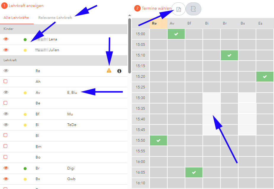 - Wenn eine Lehrkraft ein Gespräch wünscht, wird das wie in der ersten Lehrkraft-Zeile mit einem orangen Dreieck vermerkt.
