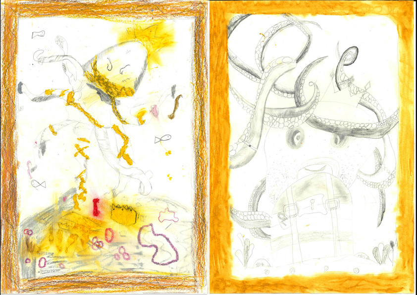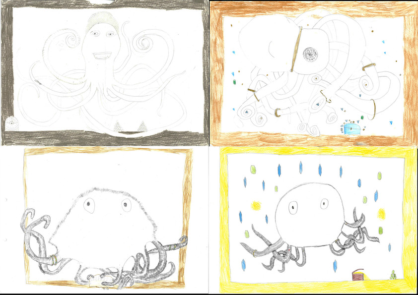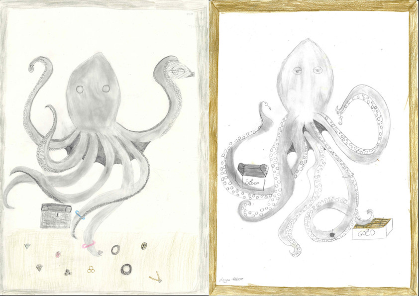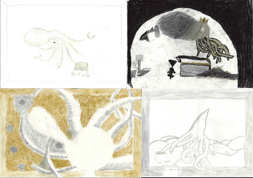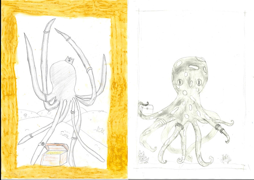 Zur Inspiration dienten Tierzeichnungen, unter anderem von Albrecht Dürer, sowie kurze Videos von realen Kraken. Gezeichnet wurde der Krake ausschließlich mit Bleistift. Lediglich der Schatz und der Goldrahmen durften farbig dargestellt werden. Mithilfe formgebender Binnenlinien und sorgfältiger Schattierung entstanden runde, wulstige Körperformen, sowie dynamische Tentakel mit spannenden Über- und Unterschneidungen.