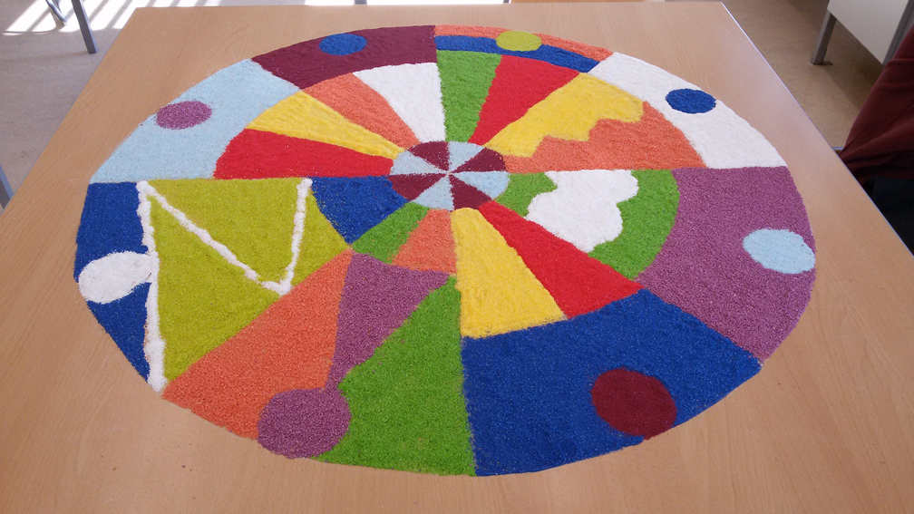 Als Abschied, nach acht Jahren im Georg von Peuerbach-Gymnasium, hat die Religionsgruppe der 8S Klasse, in Anlehnung an tibetisch-buddhistische Vorlagen, ein Sandmandala erstellt. Wie es im Buddhismus üblich ist, wurde dieses Mandala mit einem Segen/Wunsch versehen und zerstört. Anschließend wurde der Sand der Donau übergeben, die diesen Segen in die Welt hinaustragen soll.