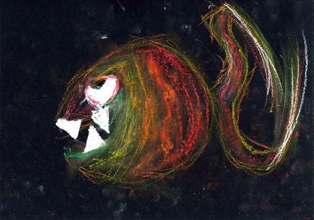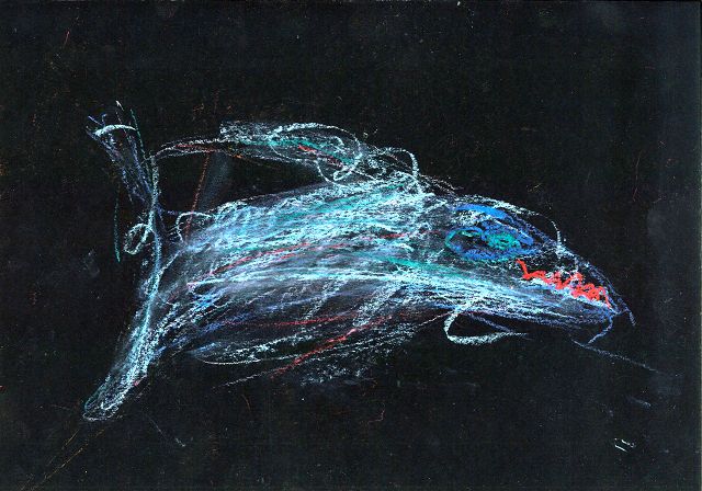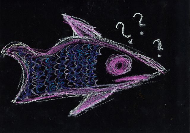 Inspiriert von dem Buch „Heute bin ich“ von Mies van Hout sollten sich die Schüler als Fisch darstellen und wie sie sich derzeit fühlen. Umgesetzt wurde das mit Ölkreiden auf schwarzem Tonpapier. Auf der Rückseite sollten sie diese Stimmung mit einem Wort in Form und Farbe umsetzen. Viel Spaß beim Raten. Hier die tollen Arbeiten.