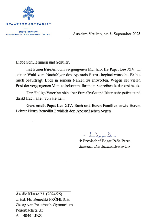 Am Schulbeginn erhielten die Schülerinnen und Schüler der 3A einen besonderen Brief – Post aus dem Vatikan – als Antwort auf ihre Gratulationswünsche an Papst Leo XIV.
