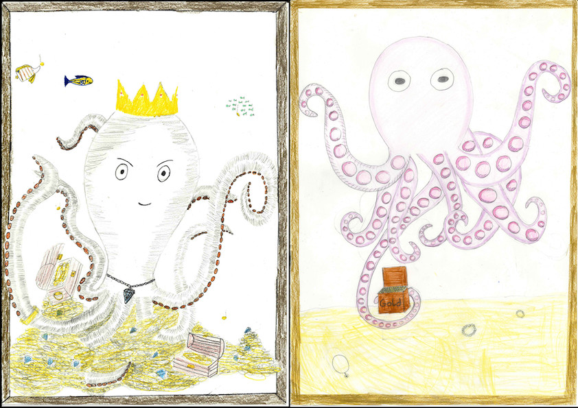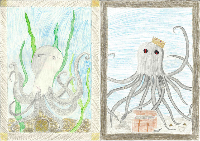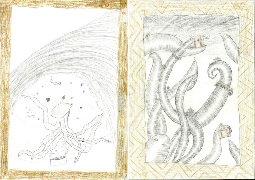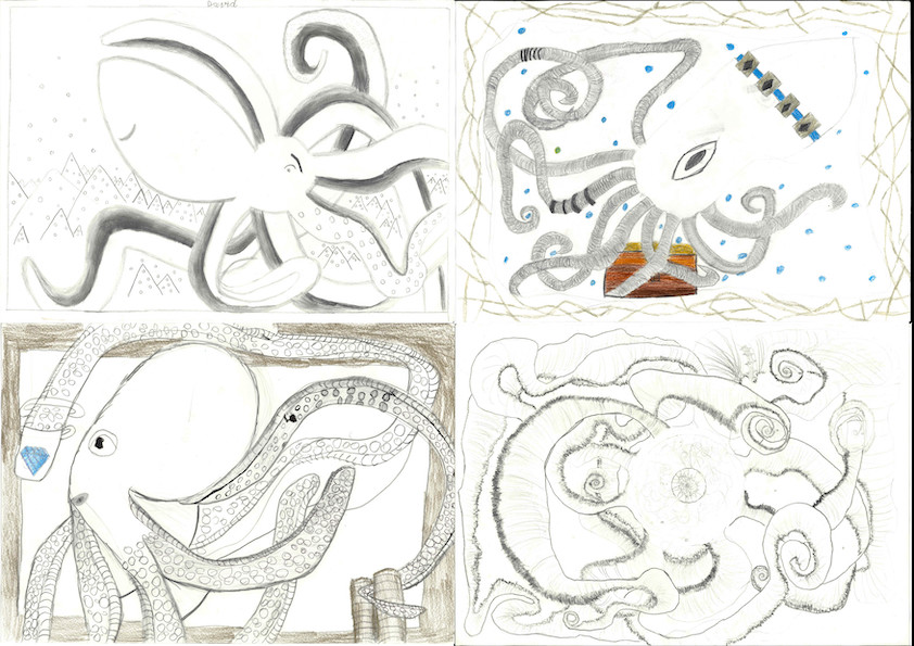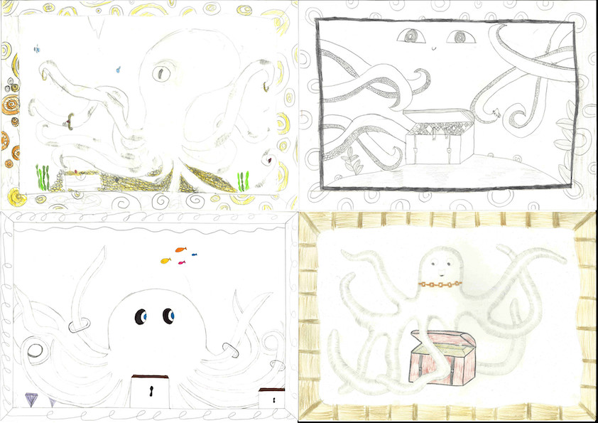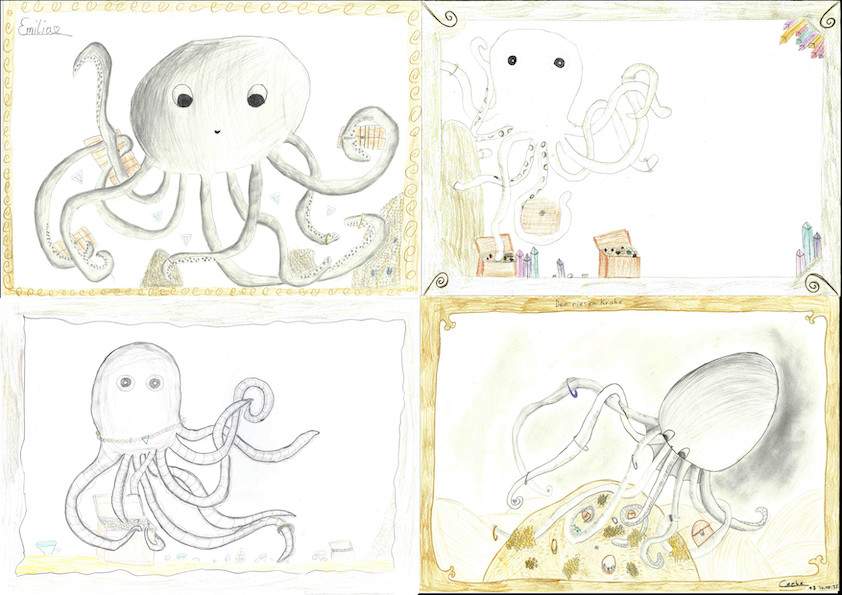 Zur Inspiration dienten Tierzeichnungen, unter anderem von Albrecht Dürer, sowie kurze Videos von realen Kraken. Gezeichnet wurde der Krake ausschließlich mit Bleistift. Lediglich der Schatz und der Goldrahmen durften farbig dargestellt werden. Mithilfe formgebender Binnenlinien und sorgfältiger Schattierung entstanden runde, wulstige Körperformen, sowie dynamische Tentakel mit spannenden Über- und Unterschneidungen.