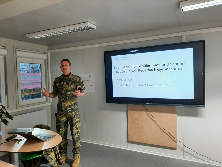 Am letzten Freitag vor Weihnachten wurden wie immer die siebten Klassen über das österreichische Bundesheer und den Zivildienst informiert. Diese Informationsveranstaltung wird im Rahmen der geistigen Landesverteidigung schon seit Jahren in dankenswerter Zusammenarbeit von ÖBH und Rotem Kreuz bzw. Samariterbund organisiert.