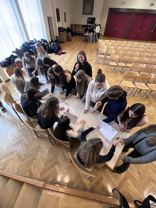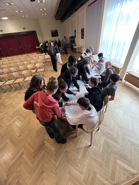 Die 5AT, 5B und 5S wurden in vier Gruppen eingeteilt. Gemeinsam mit den tollen Gruppenleitern Ralph, Tom, David und Maxime verbrachten sie die gesamte Woche in einem ausschließlich englischen Umfeld. Es wurde unter anderem über Gerichtsverfahren diskutiert und als Abschluss das berühmte traveler and travel agency Spiel gespielt.