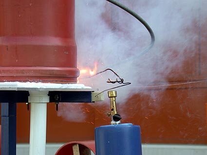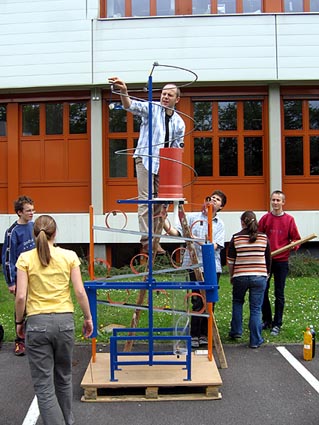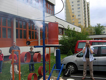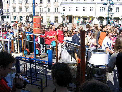 Unten einige Bilder vom Bau, von den ersten Versuchen und von der Präsentation am 12. Mai 2005 am Linzer Hauptplatz, bei der die Höllenmaschine reibungslos funktionierte.